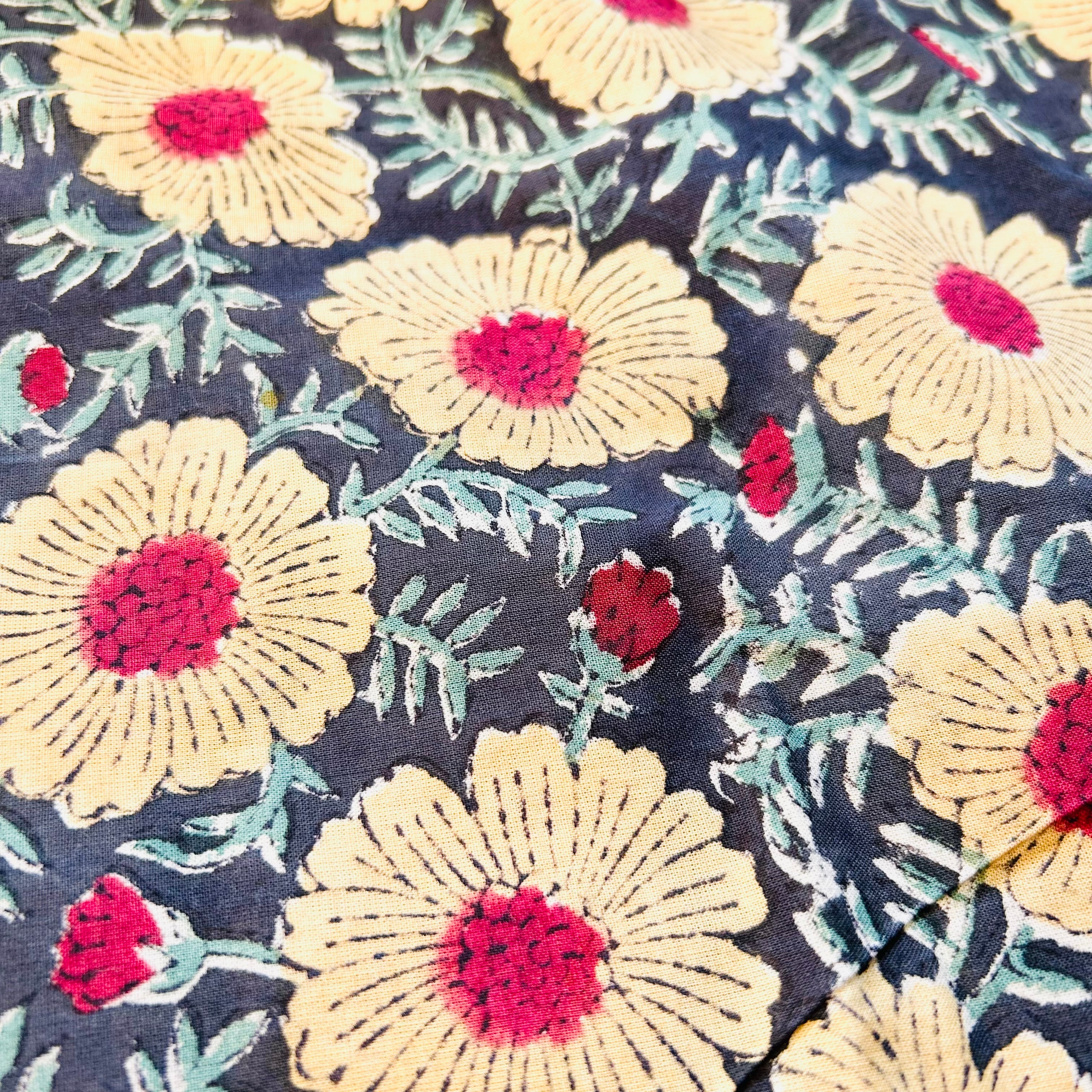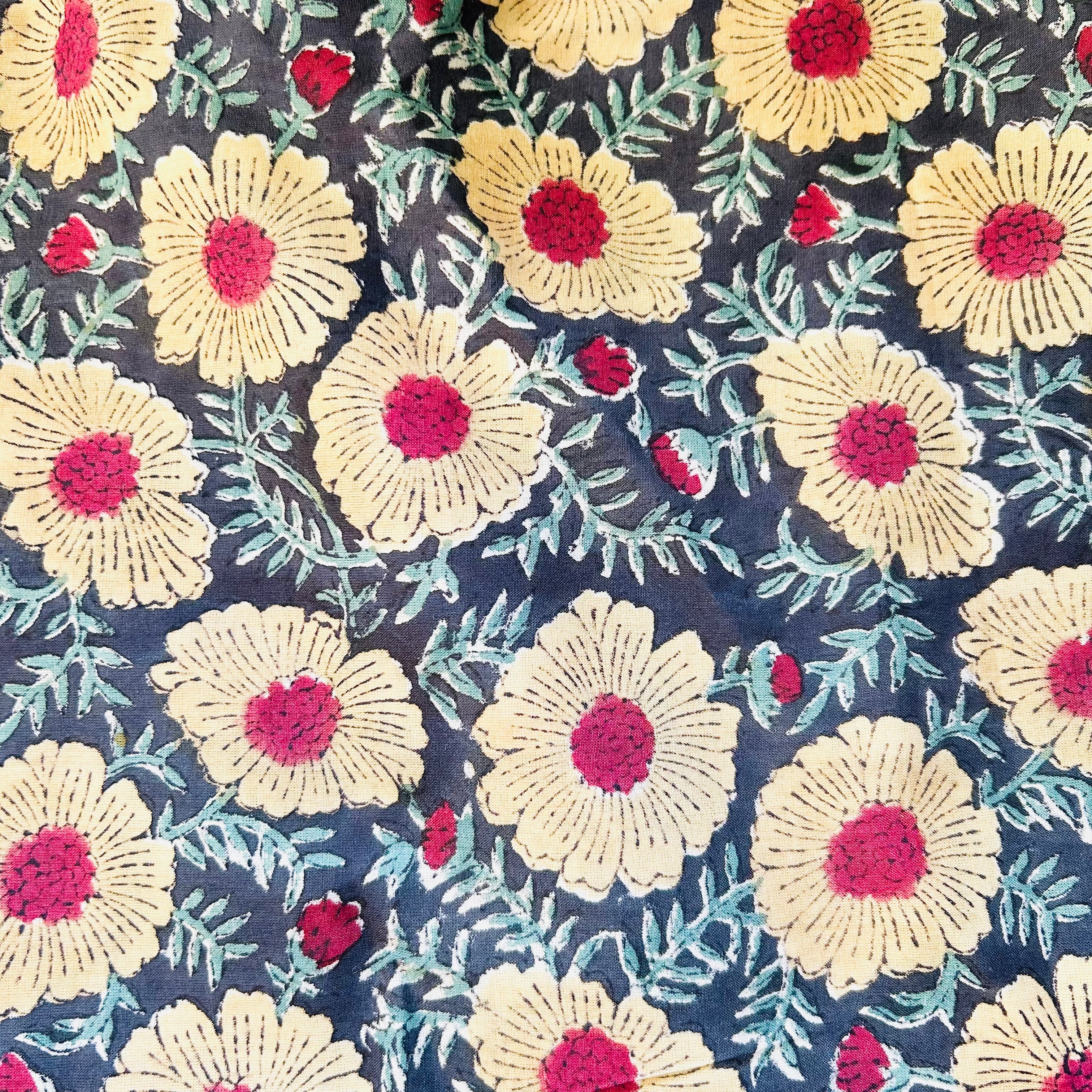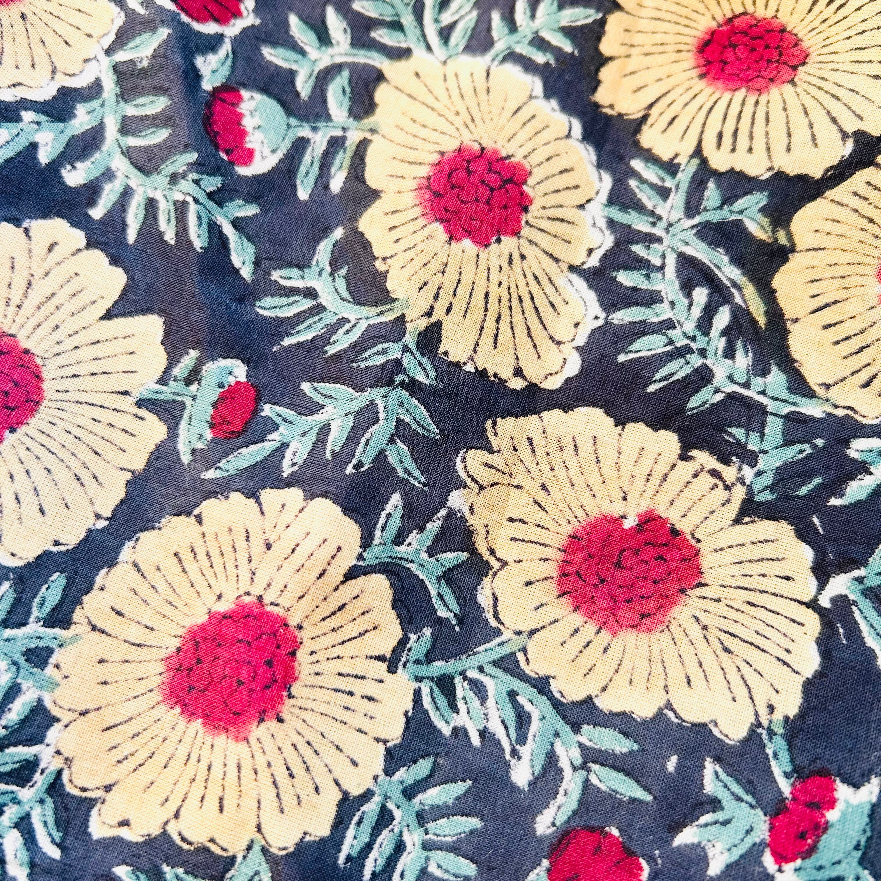 木を彫って作ったスタンプに、版画と同じ要領でインクをつけて一柄ずつ一色ずつ職人さんが手作業で生地に色を重ねていくインドの伝統的なプリント生地です。