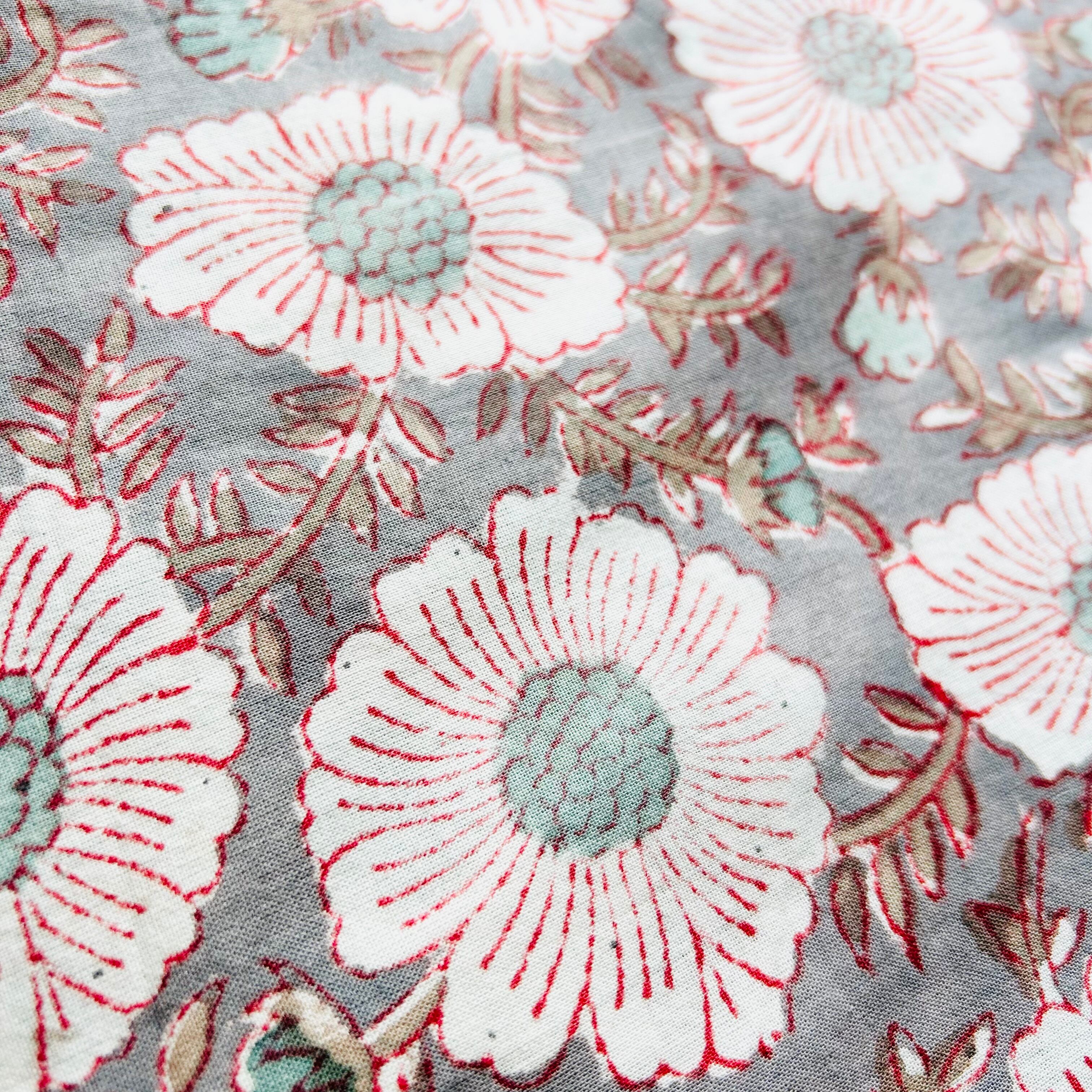 木を彫って作ったスタンプに、版画と同じ要領でインクをつけて一柄ずつ一色ずつ職人さんが手作業で生地に色を重ねていくインドの伝統的なプリント生地です。