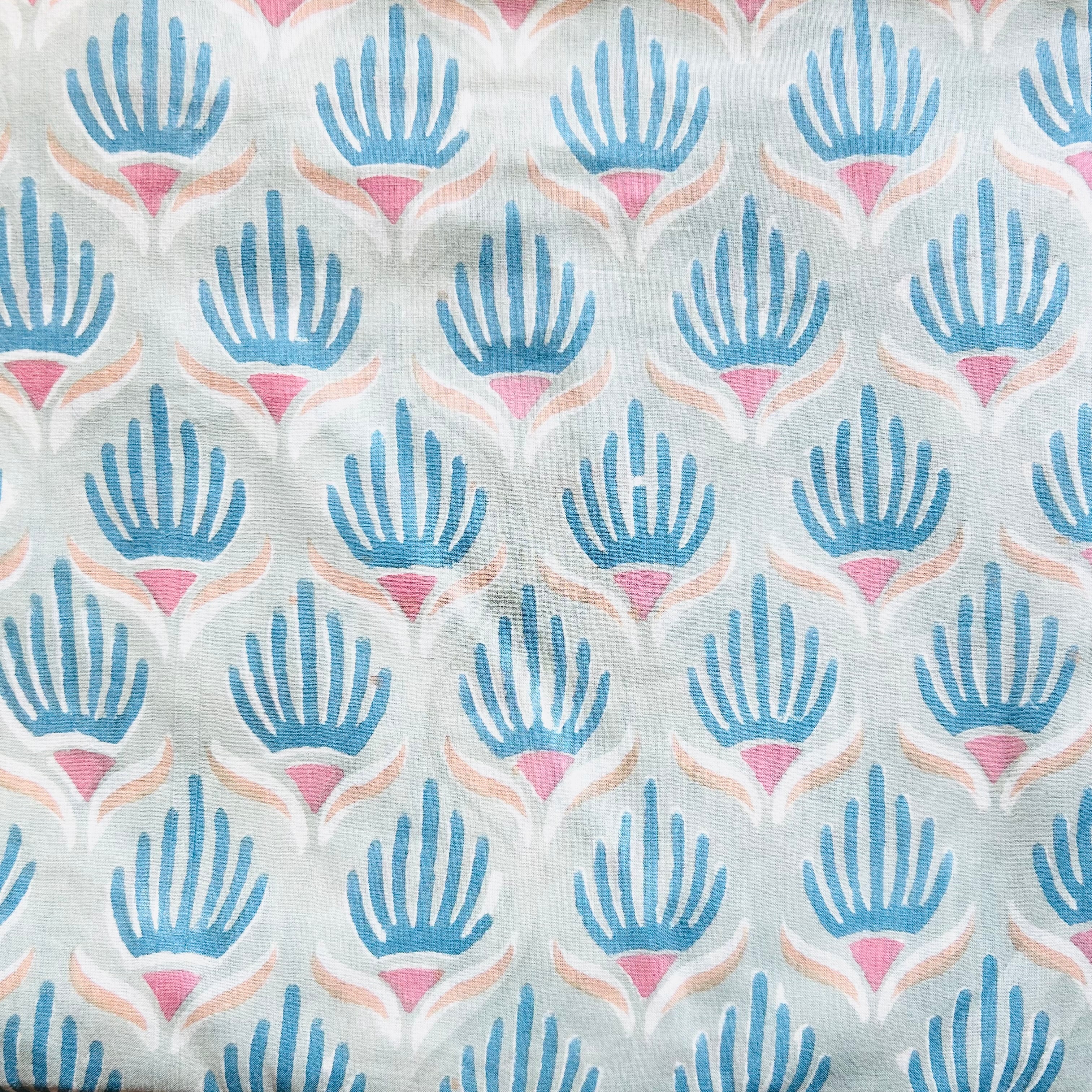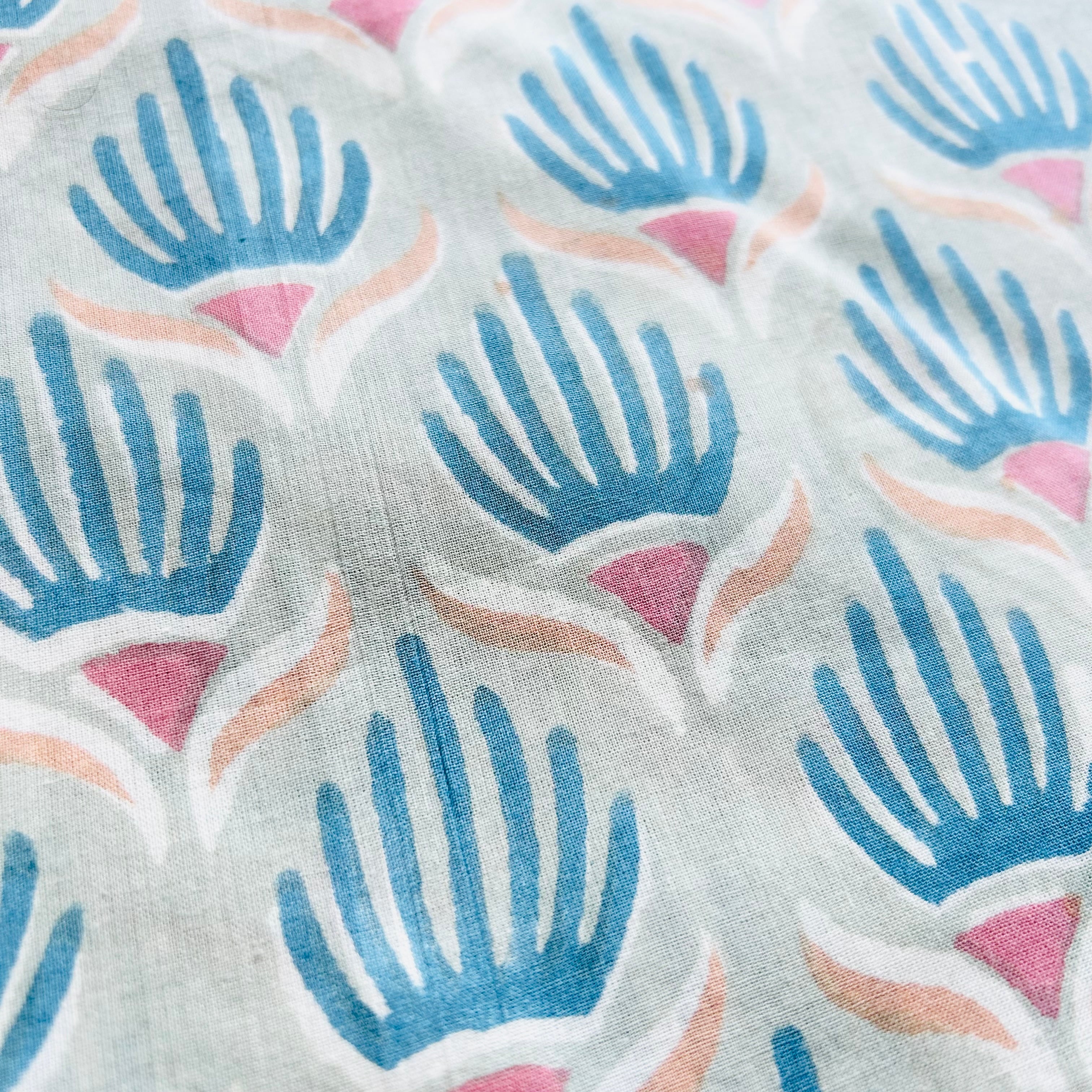 木を彫って作ったスタンプに、版画と同じ要領でインクをつけて一柄ずつ一色ずつ職人さんが手作業で生地に色を重ねていくインドの伝統的なプリント生地です。