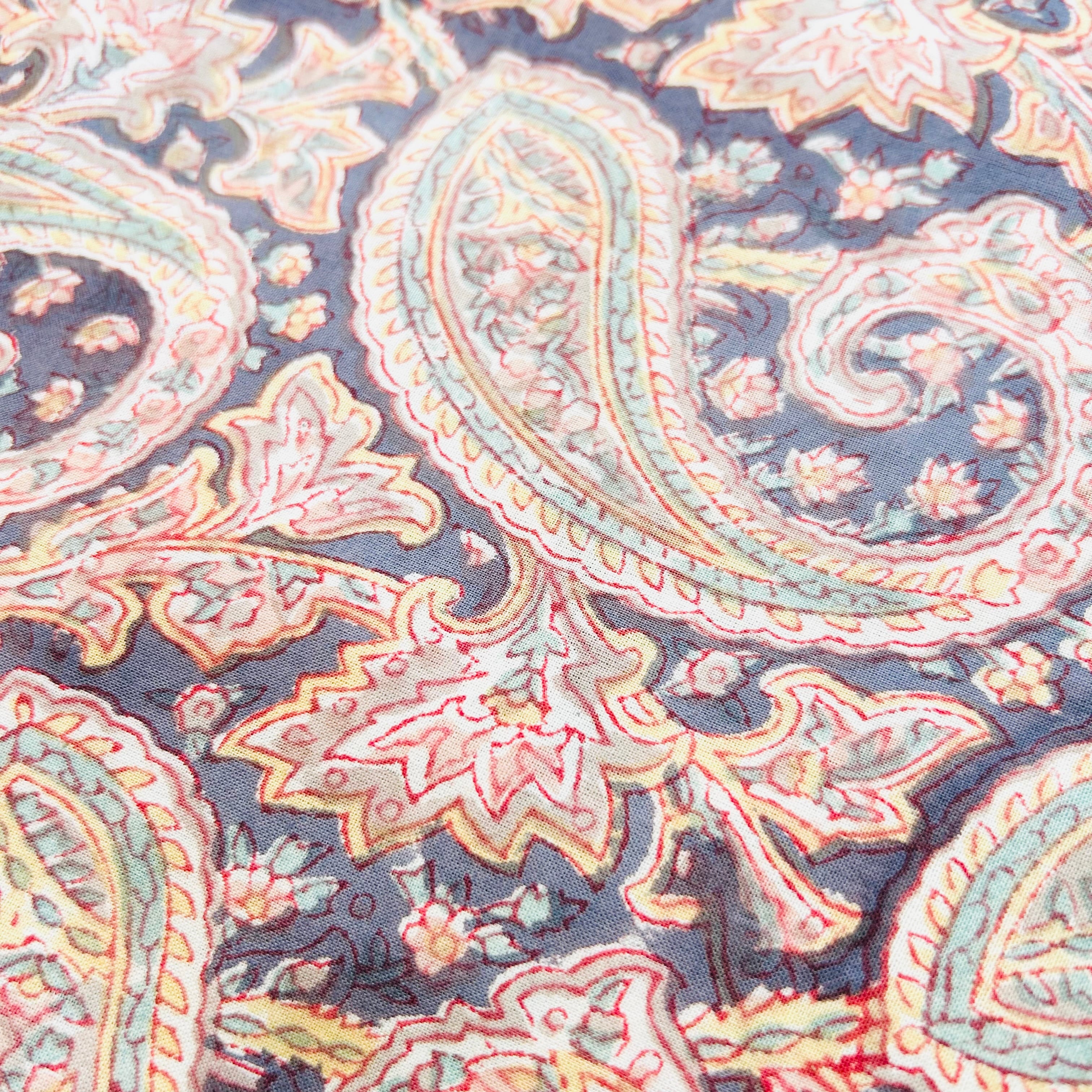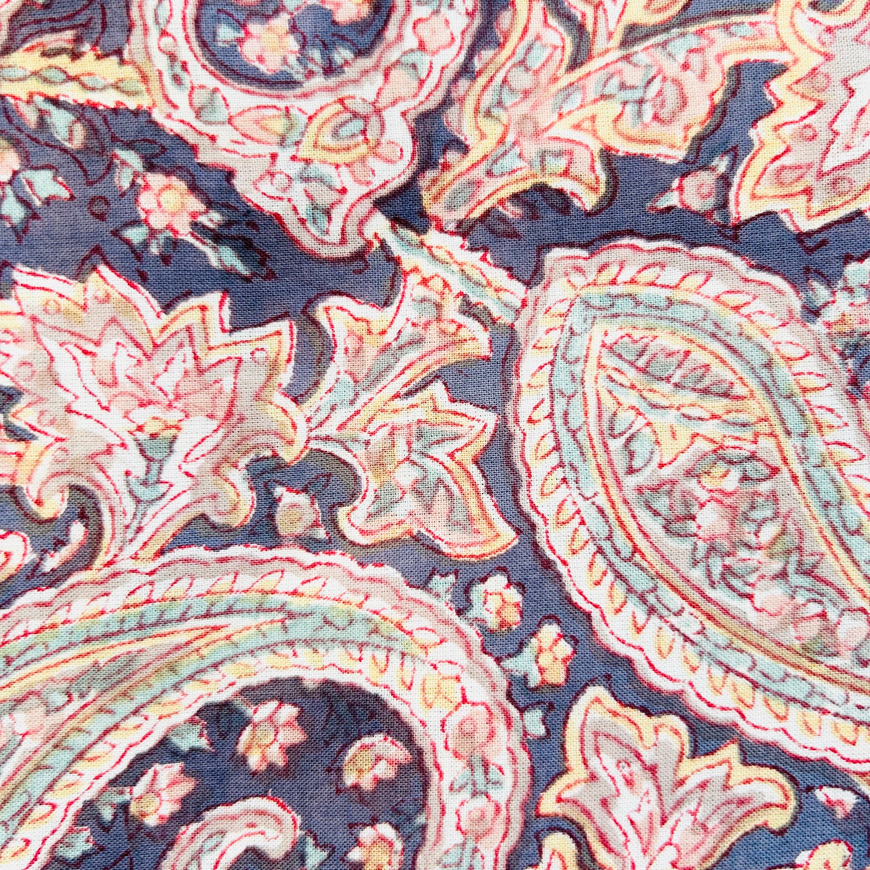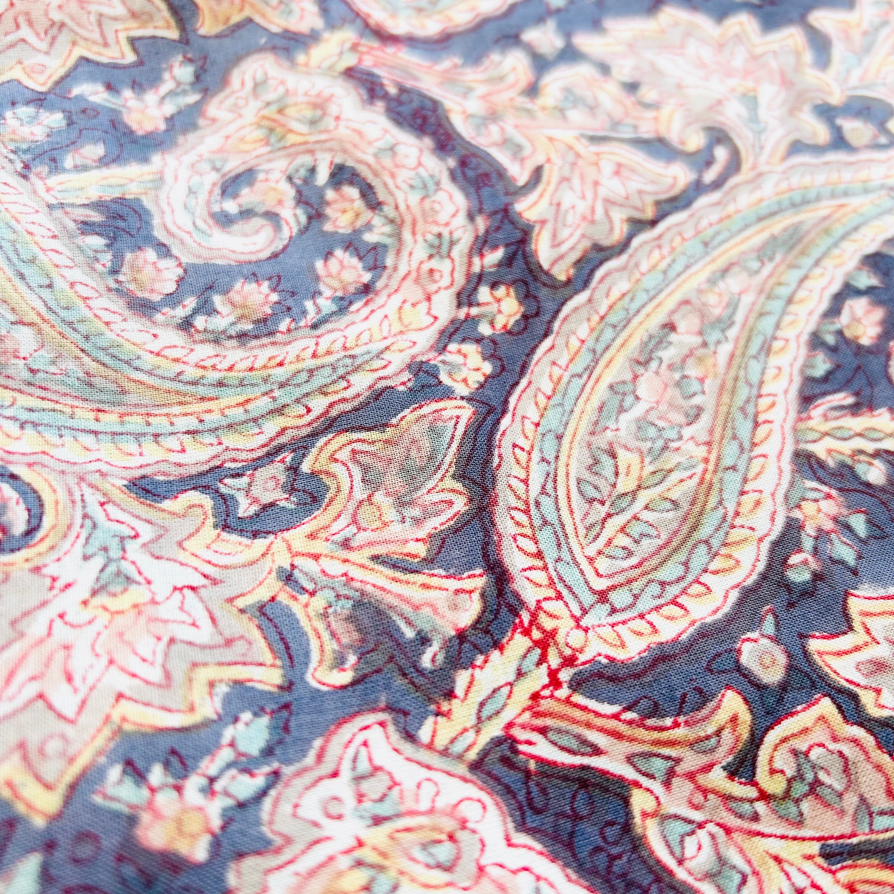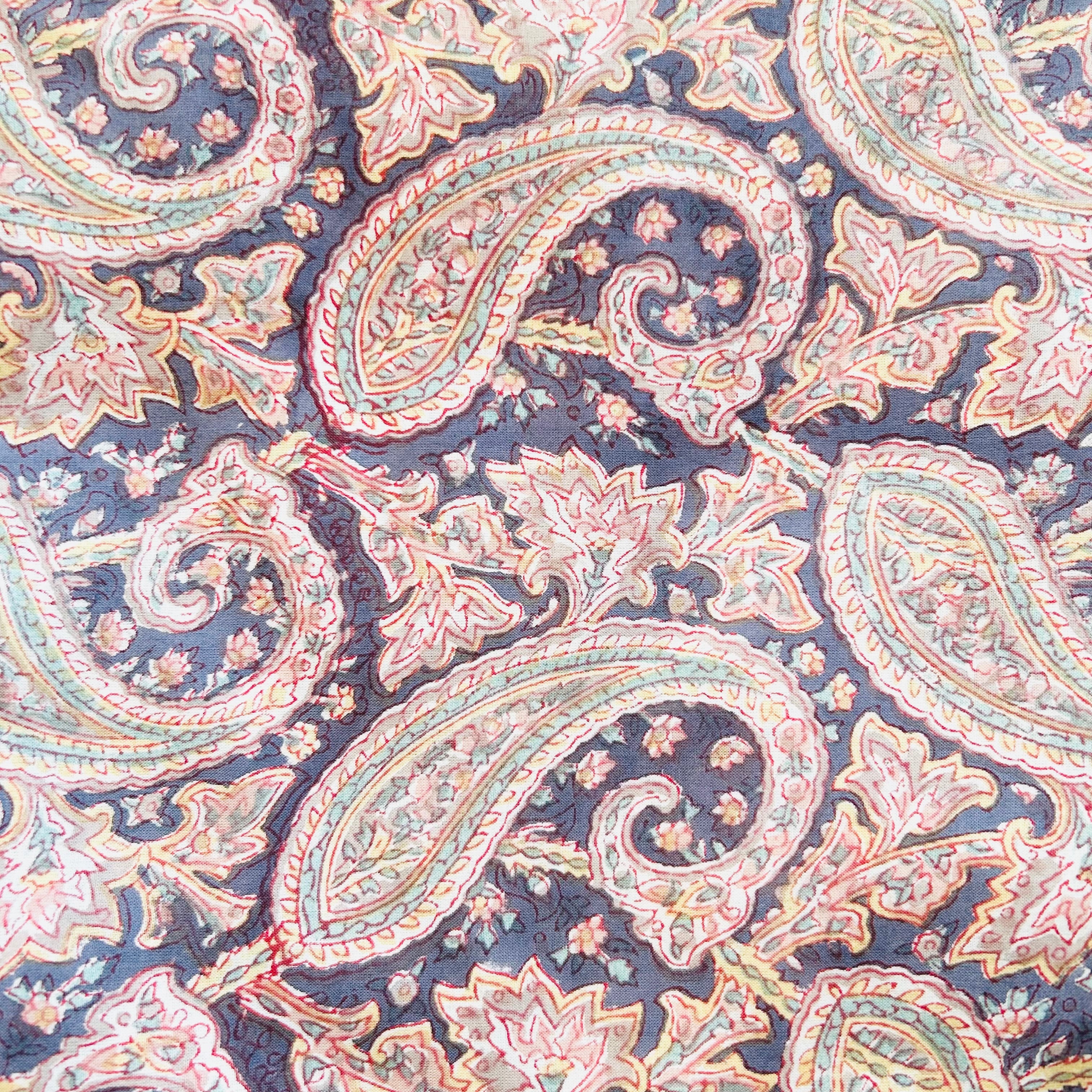 木を彫って作ったスタンプに、版画と同じ要領でインクをつけて一柄ずつ一色ずつ職人さんが手作業で生地に色を重ねていくインドの伝統的なプリント生地です。