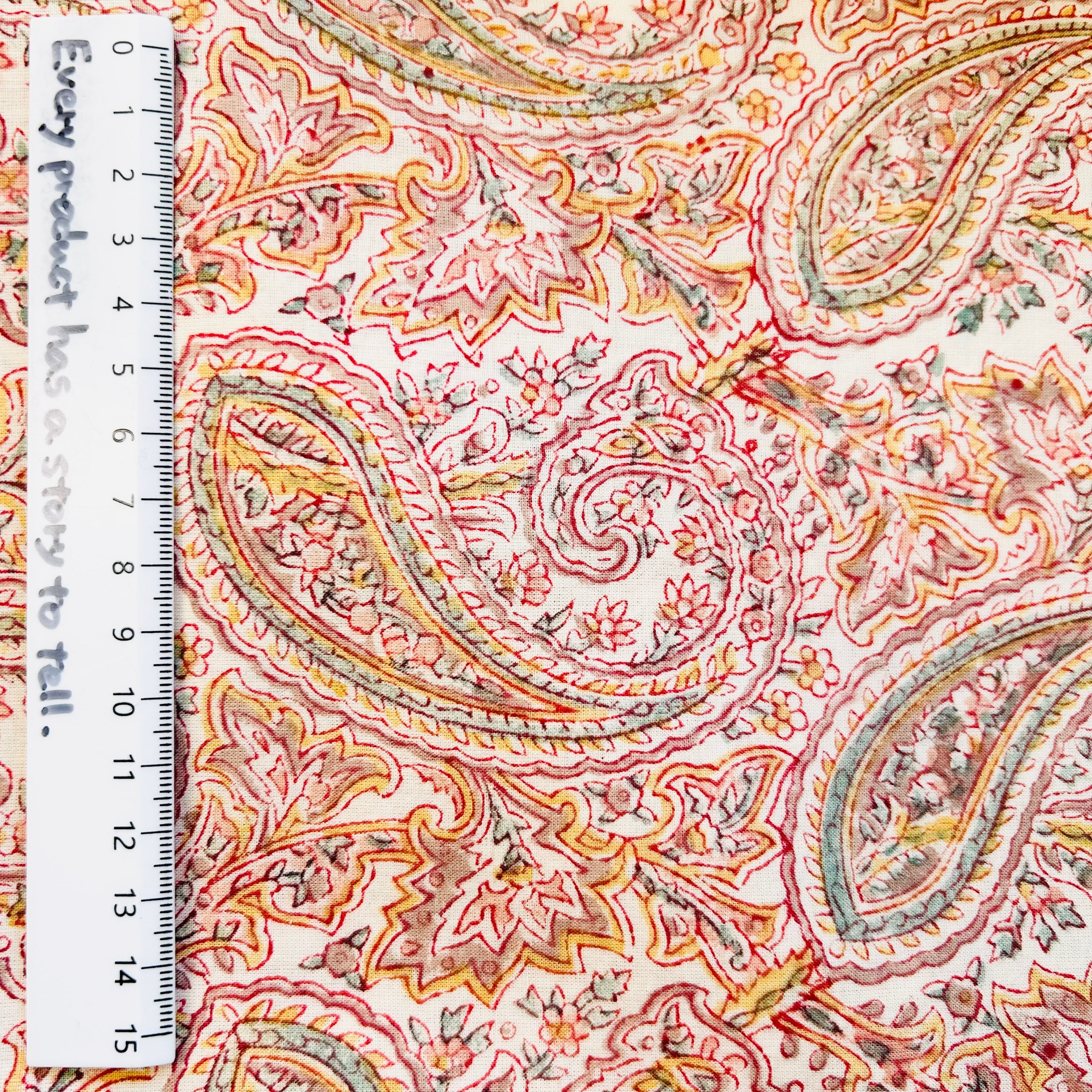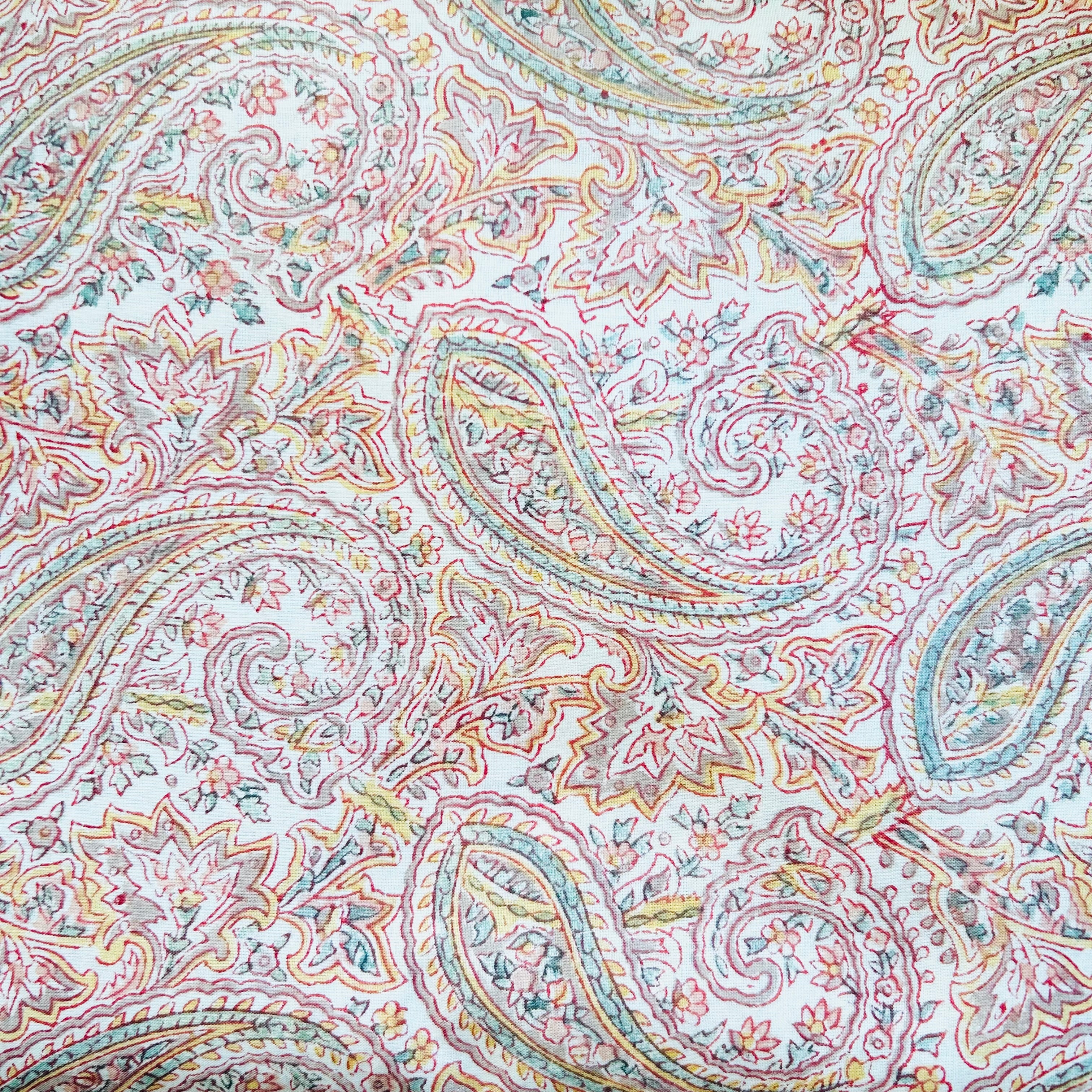 木を彫って作ったスタンプに、版画と同じ要領でインクをつけて一柄ずつ一色ずつ職人さんが手作業で生地に色を重ねていくインドの伝統的なプリント生地です。